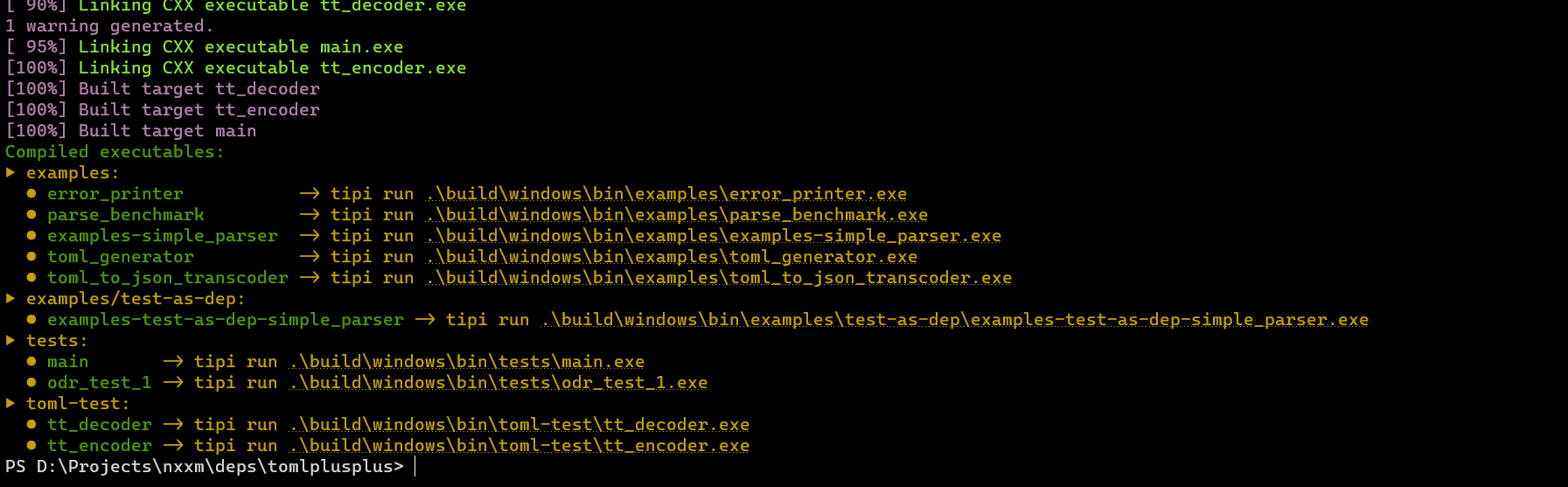 The real creature comfort comes with the end-of-build listing of your project's executables which finally makes the build more explorable: